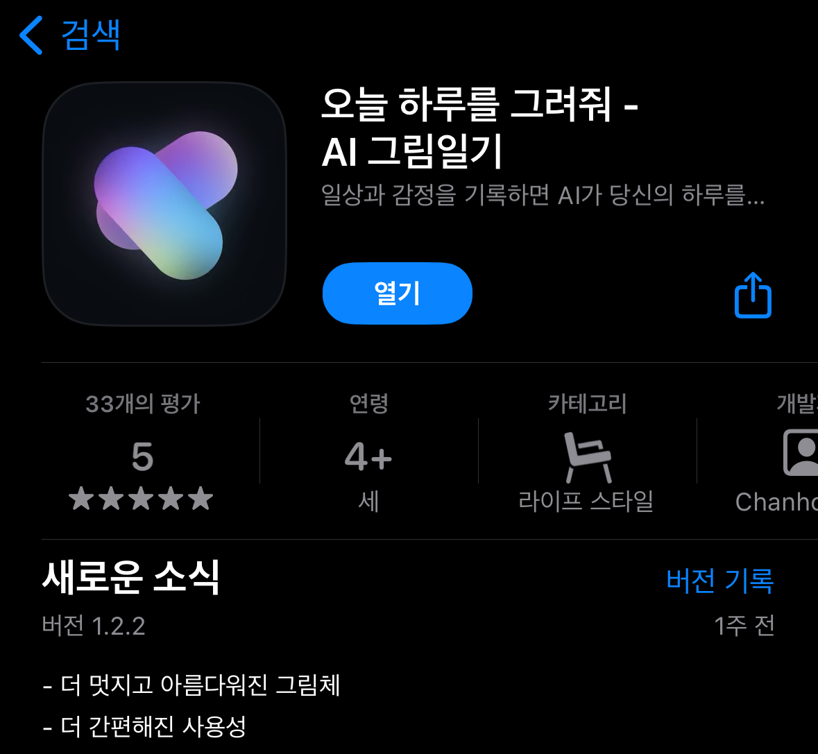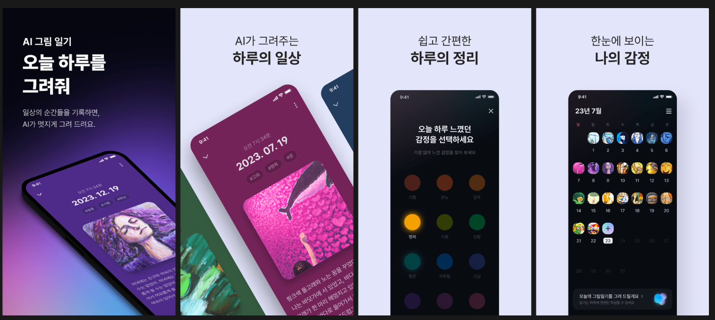 GPT 등으로 한창 핫해지고 있는 AI 분야와 접목해서 만들어진 'AI 그림일기' 서비스는 현재도 꾸준히 버전이 업데이트 되고 있으며, 현시점 기준 앱스토어에서 5점 만점 평가를 받고 있는 아주 멋지고 신선한 서비스 입니다.
