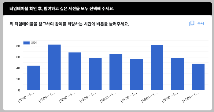 사실 어떠한 주제들이 많은 분들에게 공감을 사고 열정을 나눌 수 있을지 많은 고민을 했던 터라 세션 주제에 대해서 사전수요조사 부터 진행했었는데, 기대한 바 이상으로 수요조사의 응답이 좋아서 계획했던 수요조사 기간을 기다리지 않고 약 3일만에 수요조사 설문을 마감했었어요.