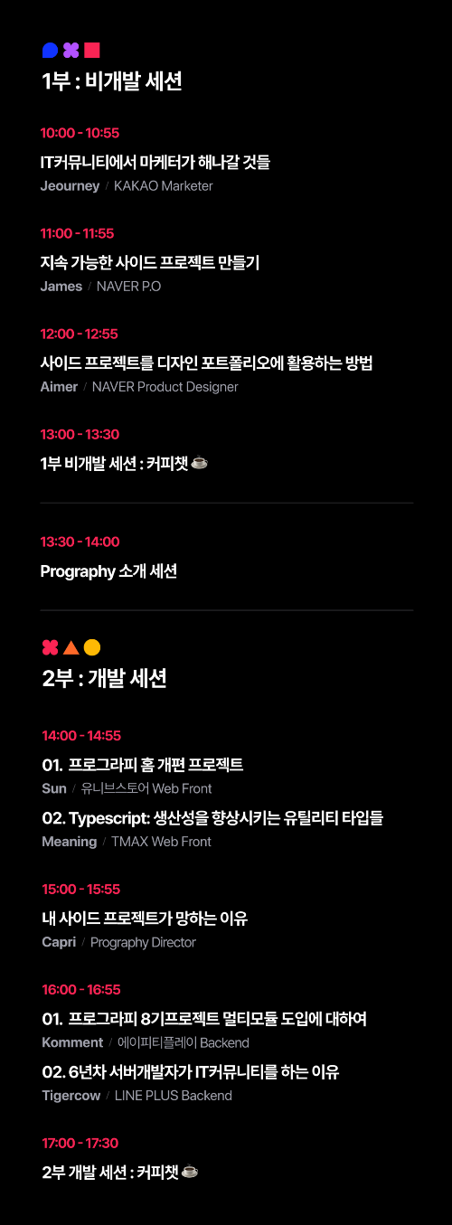 Prography에서 준비한 네트워킹 세미나는 프로그라피 소개 세션을 포함하여 총 9개의 세션으로 구성이 되었습니다. 그리고 총 1시간의 커피챗이 준비되어 있었습니다.